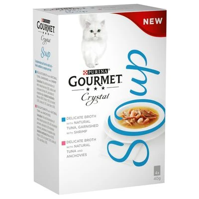 ¡Por fin ha llegado la comida que todos los gatos estaban esperando! Una comida húmeda con más caldo que nunca para que tu pequeño felino disfrute con cada lametazo. Los sobres de Gourmet Crystal Soup contienen un alimento exquisito elaborado con los mejores ingredientes de la naturaleza y con trozos de pollo, atún, salmón, marisco y verduras saludables. Todas las materias primas se cocinan con cuidado para conservar su aroma puro e increíble textura. Este alimento se prepara sin colorantes, conservantes ni aromas artificiales. ¡Consiente a tu gato de forma natural con esta comida húmeda elegida producto del año 2017!
