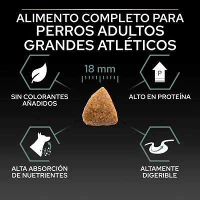 - Con vitaminas, minerales y oligoelementos que satisfacen las necesidades alimentarias de los perros grandes y atléticos