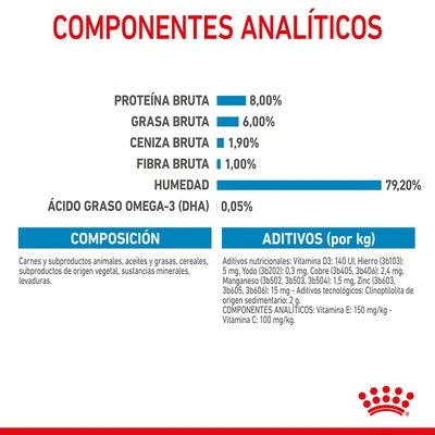 Royal Canin Mini Puppy se ha creado para complacer incluso el paladar de los perros más exigentes. La textura y el tamaño de los pedacitos en salsa son adecuados para los cachorros pequeños y pueden estimular su apetito, gracias a su sabor. Esta comida húmeda ofrece una experiencia sensorial positiva para los cachorros y se puede combinar a la perfección con el pienso Royal Canin Mini Puppy.